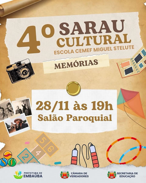 Vem aí o 4º Sarau Cultural da Escola CEMEF Miguel Stelute! Dia 28 de novembro, às 19h00, no Salão Paroquial. Prestigie!