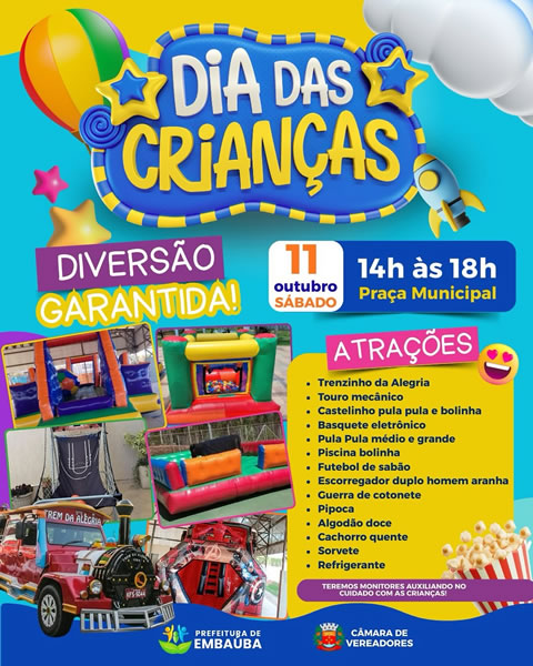 Será no próximo sábado, dia 11 de outubro, das 14h00 às 18h00. Leve a criançada até a praça municipal para uma tarde de diversão garantida, com trenzinho, pula pula, piscina de bolinha, touro mecânico, pipoca, algodão doce, refrigerante, sorvete e muito mais!