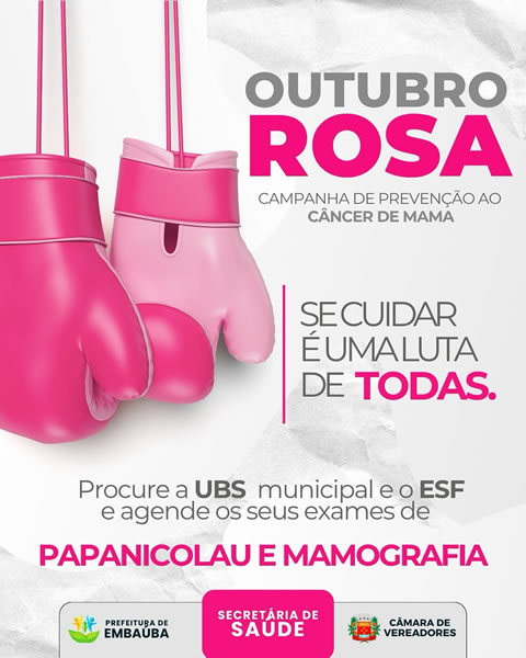 Outubro é o mês de conscientização e prevenção ao câncer de mama. Procure a UBS e o ESF e agende seus exames de papanicolau e mamografia.