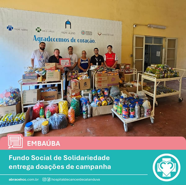 O Fundo Social de Solidariedade de Embaúba concluiu mais uma edição da campanha de arrecadação em apoio ao Hospital de Câncer de Catanduva (HCC). Graças ao engajamento da comunidade foram arrecadados e entregues 1.063 caixas de gelatina, 509 frascos de detergente, 245 pacotes de bolacha, 100 litros de leite, 13 pacotes de macarrão, 12 frascos de óleo e 70 kg de arroz, além de diversos outros itens, como sal, farinha, fubá, limpa alumínio, molho de tomate, açúcar e leite condensado.