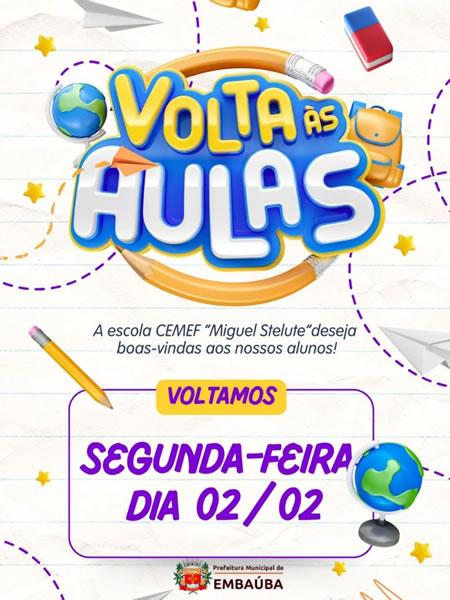 A CEMEI "Miguel Stelute" informa que as aulas retornam na próxima segunda-feira, dia 02 de fevereiro.